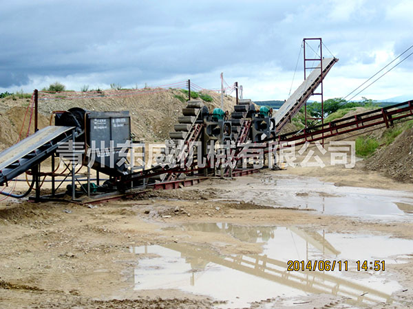 挖斗洗砂機工作時,電機通過三角帶、減速機、齒輪減速后帶動上料機,均勻給料到滾篩進行篩分,合格產(chǎn)品經(jīng)過溜槽進入洗槽中,此時鏈斗裝置的動力系統(tǒng)帶動四角輪緩慢轉(zhuǎn)動,在鏈斗的帶動下翻滾,并互相研磨,除去覆蓋砂石表面的雜質(zhì),同時破壞包覆砂粒的水汽層,以利于脫水;同時加水,形成強大水流,及時將雜質(zhì)及比重小的異物帶走,并從溢出口排出,完成清洗作用。干凈的砂石由挖斗提起,砂石從上四角輪倒入出料槽,完成砂石的清洗作用。