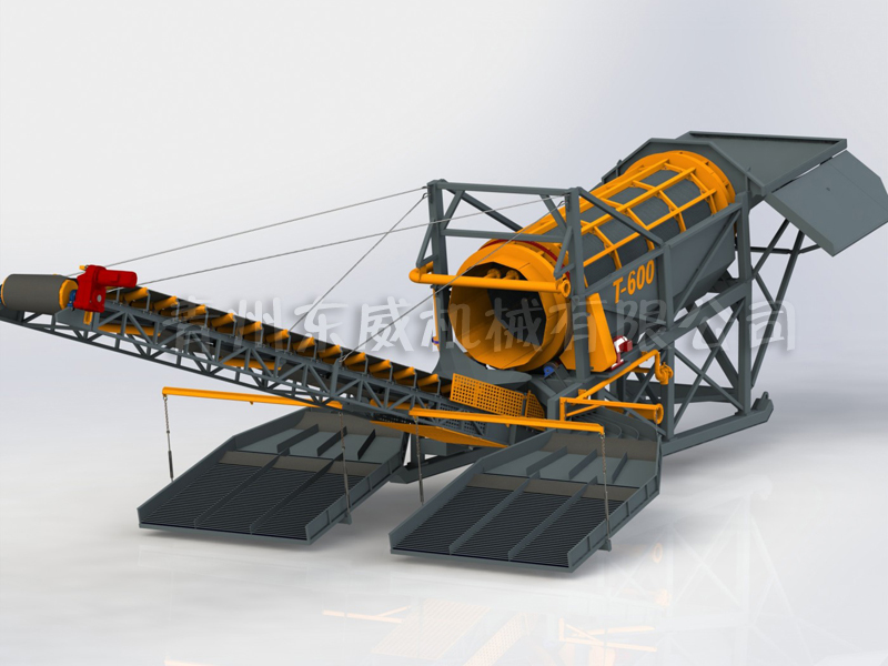 設(shè)備由料倉、滾筒篩、固定溜槽、鼓動溜槽、尾料輸送機(jī)、水泵組等系統(tǒng)組成,通過電機(jī)或柴油機(jī)驅(qū)動滾筒篩及其他水泵系統(tǒng),供水量可根據(jù)原料情況通過閥門調(diào)節(jié)水量大小。