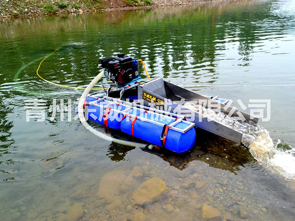 我公司生產(chǎn)的微型淘金船分為4種型號,分別為2寸、2.5寸、3寸、4寸、5.5寸微型淘金船,工作量2-10立方/小時。微型淘金船包括抽沙系統(tǒng)、供水選礦系統(tǒng)等基本系統(tǒng)構成;選金皮墊為我公司專門研發(fā)的選金膠墊選金裝置,黃金提取效率高,可對毛細金、片狀金進行回收;微型淘金船采用高強度塑料浮體,框架采用全鋁結構,極易拆裝,且重量非常輕,更符合環(huán)保要求;