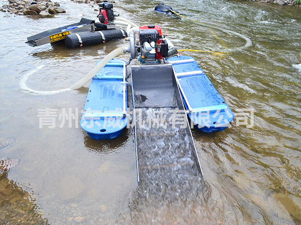 我公司生產(chǎn)的微型淘金船分為4種型號,分別為2寸、2.5寸、3寸、4寸、5.5寸微型淘金船,工作量2-10立方/小時。微型淘金船包括抽沙系統(tǒng)、供水選礦系統(tǒng)等基本系統(tǒng)構成;選金皮墊為我公司專門研發(fā)的選金膠墊選金裝置,黃金提取效率高,可對毛細金、片狀金進行回收;微型淘金船采用高強度塑料浮體,框架采用全鋁結構,極易拆裝,且重量非常輕,更符合環(huán)保要求;
