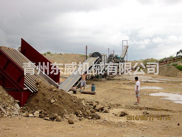 挖斗洗砂機工作時,電機通過三角帶、減速機、齒輪減速后帶動上料機,均勻給料到滾篩進行篩分,合格產(chǎn)品經(jīng)過溜槽進入洗槽中,此時鏈斗裝置的動力系統(tǒng)帶動四角輪緩慢轉(zhuǎn)動,在鏈斗的帶動下翻滾,并互相研磨,除去覆蓋砂石表面的雜質(zhì),同時破壞包覆砂粒的水汽層,以利于脫水;同時加水,形成強大水流,及時將雜質(zhì)及比重小的異物帶走,并從溢出口排出,完成清洗作用。干凈的砂石由挖斗提起,砂石從上四角輪倒入出料槽,完成砂石的清洗作用。